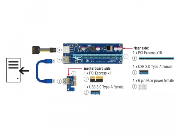 PCI Express riser card od Delocku může být připojena do jakéhokoliv slotu PCI Express x1 na základní desce. Poté může být slot x16 PCI Express umístěn v jiné pozici. To umožňuje pracovat grafické kartě v každém slotu PCIe na základní desce, I když je grafická karta širší než jeden slot. Pomocí několika riser karet může být několik grafických karet provozována současně na jedné základní desce, např. pro sledování krypto měn jako jsou Bitcoin, Ethereum nebo Zcash. Poznámka Obsah balíčku obsahuje riser kabel USB 3.0 s délkou 60 cm. V tomto kabelu nejsou přenášeny žádné signály USB. Proto není možné jej zaměnit jiným nebo delším kabelem. Speciální vlastnosti PCIe x16 grafická karta může být použita ve slotu PCIe x1. Specifikace • Konektor: Strana ze základní desky: 1 x PCI Express x1 1 x USB 3.0 Typ-A samice Strana Riser: 1 x PCI Express x16 1 x USB 3.0 Typ-A samice 1 x 6 pin PCIe napájení samice • Rychlost přenosu dat 800 MB/s • 4 x FP pevné kondenzátory zajišťují bezpečné napájení grafické karty • 4 x montážní díry na riser kartě • Spodní strana s izolační, protiskluzovou podložkou • Datový kabel: 1 x riser kabel USB 3.0 Typ-A samec na samec cca. 60 cm (včetně konektorů) 1 x napájecí kabel 6 pin na SATA cca. 20 cm (včetně konektorů) • Rozměry riser card (DxŠxV): cca. 128,25 x 43,50 x 21,20 mm • Nezávislé na operačním systému, nevyžaduje instalaci žádných ovladačů Systémové požadavky • PC s jedním volným PCI Express x1 / x4 / x8 / x16 / x32 slotem • Napájecí zdroj s volným SATA napájecím konektorem Obsah balení • PCIe na USB riser card • USB na PCIe riser card • USB 3.0 kabel • Napájecí kabel Balení • Kartonová krabice |