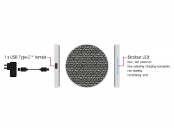 Tato certifikovaná Qi nabíjecí stanice od Delocku může být použita pro bezdrátové nabíjení mobilních zařízení. Přenos energie indukcí eliminuje potřebu kabelů a chrání konektory. Nabíječka podporuje rychlé nabíjení až 7,5 / 10 W s příslušně vybavenými smartphony. Specifikace • Konektor: 1 x USB Type-C™ samice • Nabíjecí proud: 5 V / 1,0 A (5 W), 9 V / 1,1 A (7,5 / 10 W) • Dvoubarevná LED: modrá / červená: zapnuto modrá pulzující: probíhá nabíjení červená: pohotovostní režim blikající červená: chyba • Materiál pouzdra: kovová • Protiskluzná základna • Rozměry: Průměr cca. 88 mm, výška cca. 7 mm Systémové požadavky • Napájecí zdroj s USB-A samice a 5 V / 2 A (pro 5 W nabíjení) nebo 9 V / 1,67 A (pro 7,5 / 10 W rychlonabíjení) Obsah balení • Qi nabíjecí stanice • Kabel USB Typ-A na USB Type-C™, délka ca. 100 cm Balení • Kartonová krabice |