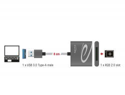 Čtečka karet od Delocku může být použita pro čtení a zápis na XQD paměťové karty. Čtečka karet může být připojena k PC nebo notebooku přes rozhranní USB Typ-A.