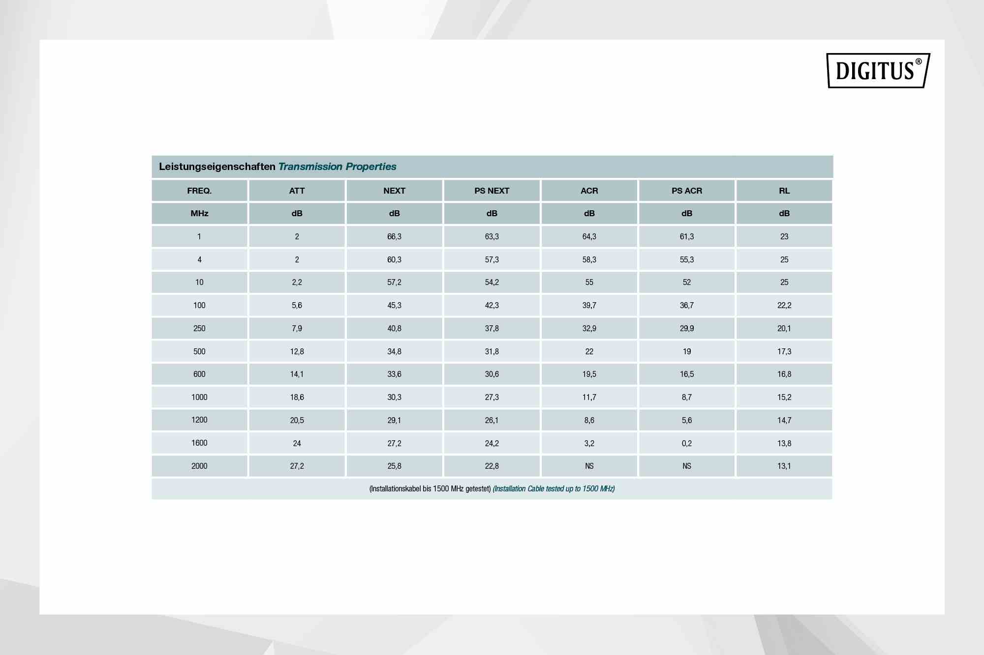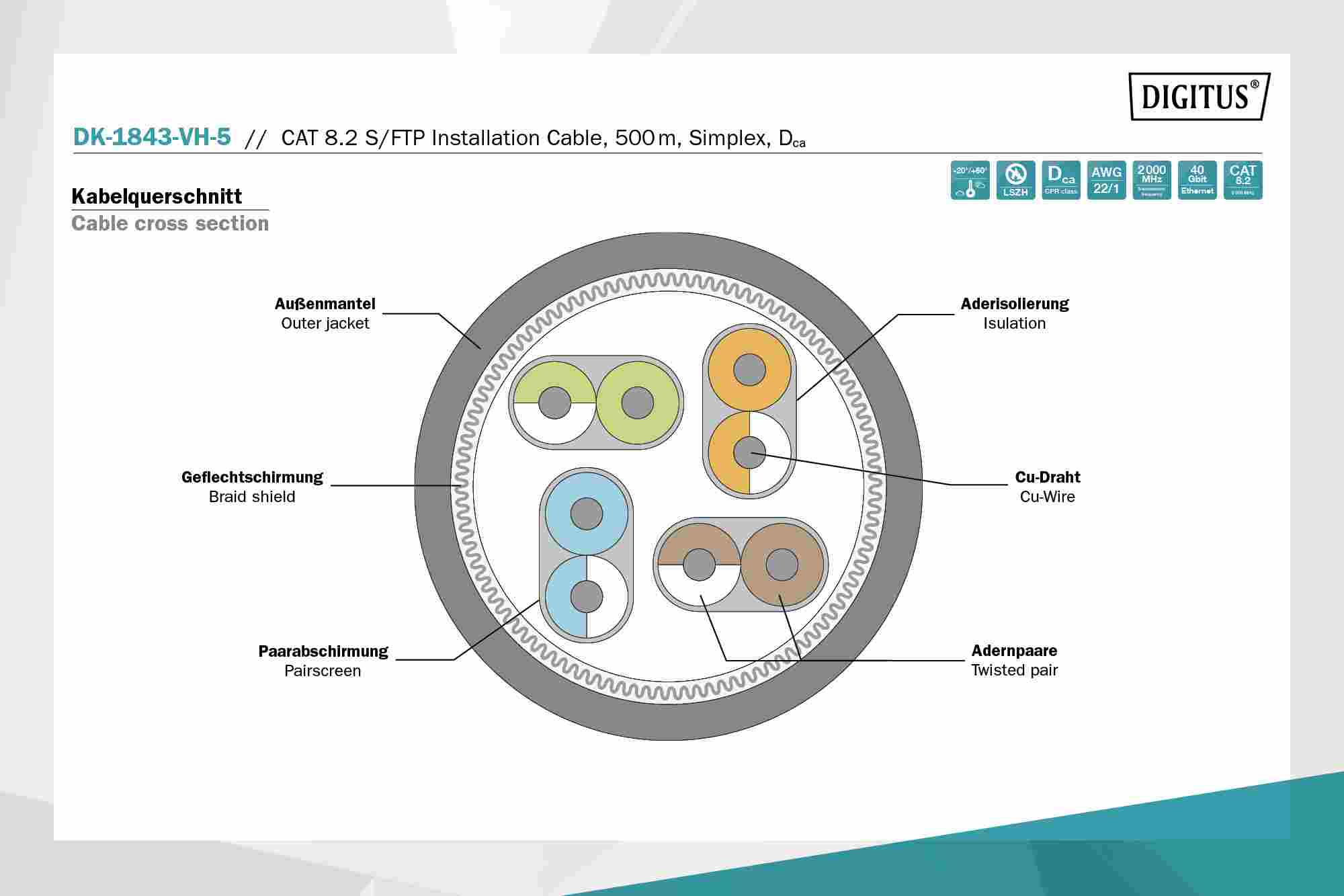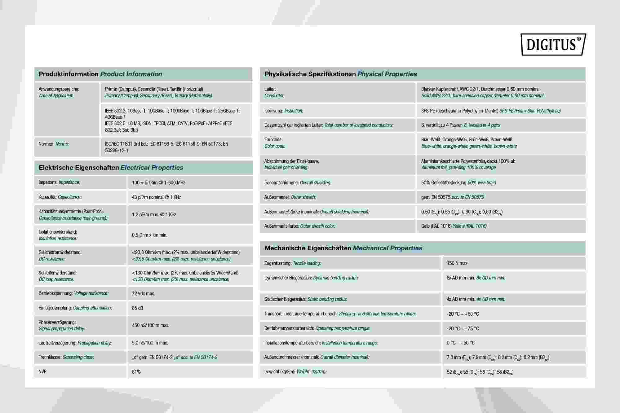 Instalační kabel DIGITUS® Professional CAT 8.2 S/FTP má následující strukturu kabelu 4x2x AWG22/1 a dosahuje přenosové frekvence až 2000 MHz. Bezhalogenový plášť kabelu splňuje normy IEC 60332-3-24, FRNC-C, LSZH-3 a CPR Euro třídy DCA Kabel je vhodný pro kabeláž budov v sekundárních a terciárních oblastech. Splňuje následující normy ISO/IEC 11801, DIN EN 50173, DIN EN 50288-12-1.