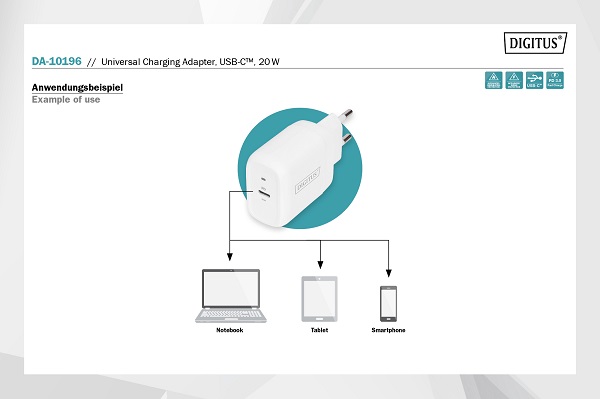 Univerzální nabíjecí adaptér od společnosti DIGITUS® je vhodný pro zařízení s rozhraním USB-C™, jako jsou chytré telefony, tablety nebo notebooky, a poskytuje výstupní výkon až 20 W. Integrovaná ochrana proti zkratu, přepětí a nadměrnému proudu zajišťuje vyšší bezpečnost. Integrovaná ochrana proti nadměrnému zahřívání navíc zabraňuje případnému přetížení a poškození nabíječky nebo připojených zařízení. LED displej poskytuje informace o aktuálním stavu nabíjení. Díky kompaktním rozměrům je nabíjecí adaptér ideální na cesty.