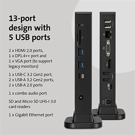 Pokud hledáte snadno použitelné dokovací řešení USB-C typu plug-and-play, které nabízí rychlost, výkon a flexibilitu pro připojení až tří monitorů, dokovací stanice SD4849Pv USB-C Triple Video je ideálním řešením. Není třeba žádné ovladače, stahování ani aktualizace - stačí připojit a pracovat. 100W napájení udržuje notebook nabitý, zatímco přenosová rychlost 10 Gb/s zajišťuje, že produktivita není nikdy ohrožena. Celkem třináct portů vám umožní flexibilně přidávat více zařízení bez dalších klíčů nebo adaptérů.
