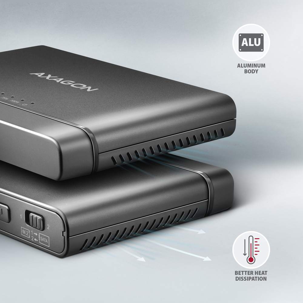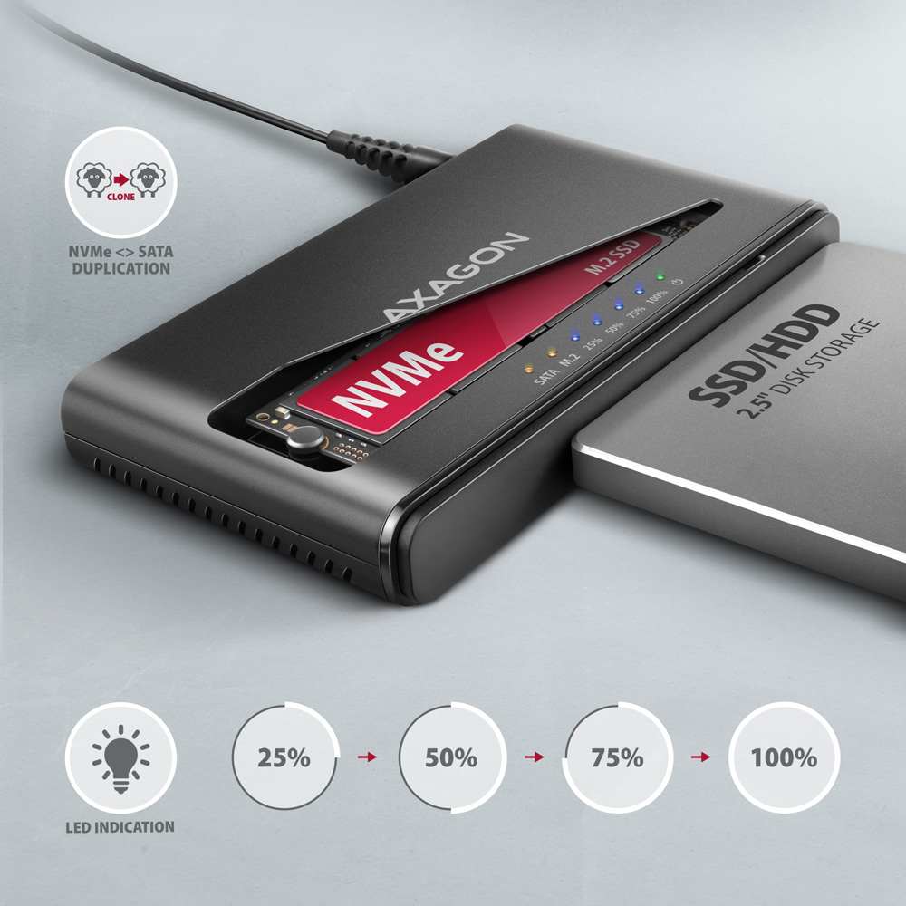 USB 3.2 Gen 2 adaptér pro připojení NVMe M.2 SSD a SATA 2.5"/3.5" disků s funkcí klonování.