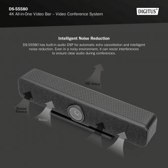 Videokonferenční systém DIGITUS® kombinuje kameru, mikrofon a reproduktor v jednom zařízení a je vhodný pro malé až středně velké místnosti. 4K Ultra-HD ePTZ (elektronická Pan-Tilt-Zoom) kamera Ultra širokoúhlý objektiv - úhlopříčka 120°, 110° horizontálně, 78° vertikálně Videohovory v rozlišení 4K Ultra HD (až 3840 x 2160 pixelů / 30 snímků za sekundu) 2,8" snímač (Sony IMX415), 8 MP Automatické rámování, Smart Zoom (4x digitální zoom) & AI Face/Speaker Tracking - Video bar využívá AI (umělou inteligenci) k automatickému nastavení polohy kamery, zaostření a zoomu tak, aby optimálně zachytil účastníky videa. Beamforming mikrofony - 4 integrované mikrofony pro formování paprsku pro zachycení řeči a 5m audio dosah (hlasový snímač) Digitální redukce šumu a potlačení akustické ozvěny - potlačuje nežádoucí šum na pozadí a eliminuje ozvěny Včetně přídavného stolního mikrofonu - dodatečný 3m hlasový snímač (audio rozsah), připojení k video baru pomocí síťového kabelu (10m, vč.) Hi-Fi reproduktor s max. 5W Dálkové ovládání je součástí balení pro pohodlné ovládání funkcí POPIS Videokonferenční systém DIGITUS® 4K kombinuje kameru, mikrofon a reproduktor v jednom zařízení a je vhodný pro malé až středně velké místnosti. Video bar lze snadno připojit k notebooku nebo počítači přes USB. Díky technologii Plug-and-Play je instalace velmi snadná, není vyžadován žádný další software. Součástí dodávky je další mikrofon, který v případě potřeby rozšiřuje zvukový rozsah, a dálkové ovládání pro pohodlné ovládání rozsahu funkcí. TECHNICKÉ ÚDAJE 4K Ultra-HD ePTZ (elektronická Pan-Tilt-Zoom) kamera Ultra širokoúhlý objektiv - úhlopříčka 120°, 110° horizontálně, 78° vertikálně Rozlišení až 4K Ultra-HD (až 3840 x 2160 / 30 Hz) 2,8" snímač (Sony IMX415), 8 MP Automatické rámování, Smart Zoom (4x digitální zoom) & AI Face/Speaker Tracking - Video bar využívá AI (umělou inteligenci) k automatickému nastavení polohy kamery, zaostření a zoomu tak, aby optimálně zachytil účastníky videa. Beamforming mikrofony - 4 integrované mikrofony pro formování paprsku pro zachycení řeči a 5m audio dosah (hlasový snímač) Digitální redukce šumu a potlačení akustické ozvěny - potlačuje nežádoucí šum na pozadí a eliminuje ozvěny Včetně přídavného stolního mikrofonu - dodatečný 3m hlasový snímač (audio rozsah), připojení k video baru pomocí síťového kabelu (10m, vč.) Hi-Fi reproduktor s max. 5W Dálkové ovládání je součástí balení pro pohodlné ovládání funkcí Automatické ovládání - clona, jas, kontrast, vyvážení bílé Stojan pro volně stojící instalaci nebo upínací zařízení pro instalaci na monitor, stejně jako šroubovací závit pro stativ/stojan Maximální vzdálenost záznamu: Minimální vzdálenost záznamu: 50 cm Kompatibilní s Windows 7 nebo vyššími, macOS 10.10 nebo vyššími, ChromeOS, Android 5.0 nebo vyššími Připojení videobaru: 1x USB-C 3.0 - připojení k hostitelskému počítači 1x RJ45 - Přídavné připojení stolního mikrofonu 1x vstup napájení - připojení externího napájecího zdroje 1x audio vstup (3,5 mm) 1x audio výstup (3,5 mm) 1x zařízení proti krádeži (standardní zámek notebooku) Mikrofon / další podrobnosti o mikrofonu: Všesměrový Hlasové snímání (rozsah zvuku): 5 m / 3 m Frekvence: 20 Hz - 24 kHz Citlivost: -26 dB / -32 dB SPL (hladina akustického tlaku): max. 120 dB / max. 115 db Podrobnosti o přednášejícím: Max. výstupní výkon 5W Odpor 4 Ohm Frekvence: 20 Hz - 24 kHz Rozměry videobaru: Š 40 x H 7.5 x V 9.2 cm Hmotnost video tyče: 1 kg Barva: černá / šedá Další rozměry mikrofonu: Š 12 x V 3 cm OBSAH BALENÍ 1x video bar 1x přídavný mikrofon 1x USB propojovací kabel (USB-C - USB-A 5 m) 1x síťový kabel (10 m) 1x dálkové ovládání (2x AAA baterie, není součástí balení) 1x napájecí adaptér (12V/2A) Uživatelská příručka 1x |