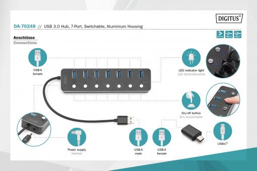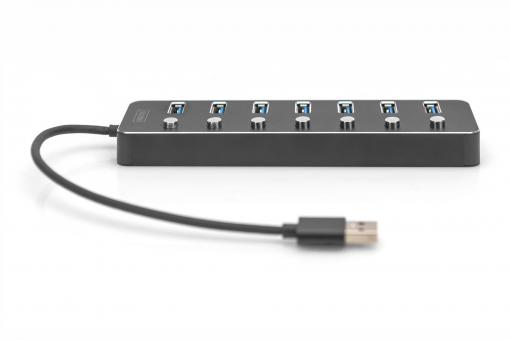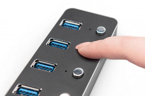 Rozbočovač USB 3.0, 7 portů, přepínač Hliníkové pouzdro, včetně zdroje 5V/2A