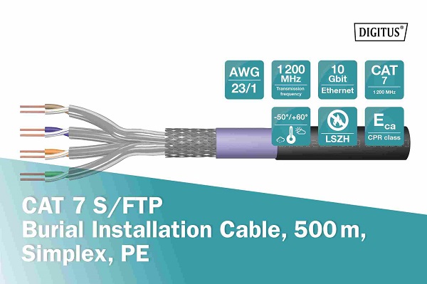 Digitus® Professional Cat.7 S/FTP kabel pro instalaci do země se vyznačuje následující konstrukcí kabelu 4x2x AWG23/1 a dosahuje přenosové frekvence až 1200 MHz. Kabel má vnější PE plášť a vnitřní bezhalogenový plášť a odpovídá normě IEC 60332-1, FRNC-B, LSZH-1 a CPR Euro třídy Eca. Kabel je vhodný pro instalaci v suchých i vlhkých prostorách, ve venkovním prostředí nebo v zemi. Vyhovuje následujícím normám ISO/IEC 11801, DIN EN 50173, DIN EN 50288-4-1.