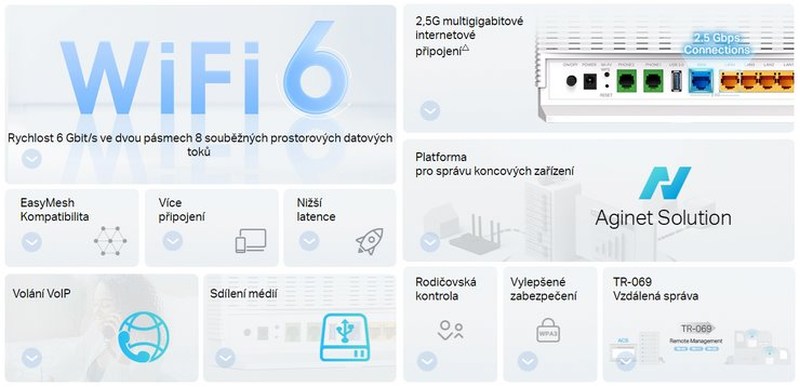 Dvoupásmový Wi-Fi 6 router AX6000 VoIP se závratně rychlou WiFi až 6Gbps umožňuje rychlejší prohlížení webových stránek, streamování a stahování – a to vše současně. Router disponuje 2.5G WAN portem, 2.5G LAN portem a 3 gigabotovými LAN porty, dual-band WiFi6 802.11ax s rychlostí na 5GHz až 4804 Mb/s a pro 2,4GHz až 1148 Mb/s. Pro připojení VOIP telefonů jsou připraveny 2 samostatné porty. Tento model také nabízí možnost nové technologie EasyMesh, která usnadní používání více zařízení zároveň jako jednu velkou síť. Díky portu USB 3.0 je možno také sdílet různá média přes síť nebo pomocí internetu. Lehkou instalaci zajistí aplikace Aginet, která vás provede jednoduchou konfigurací.