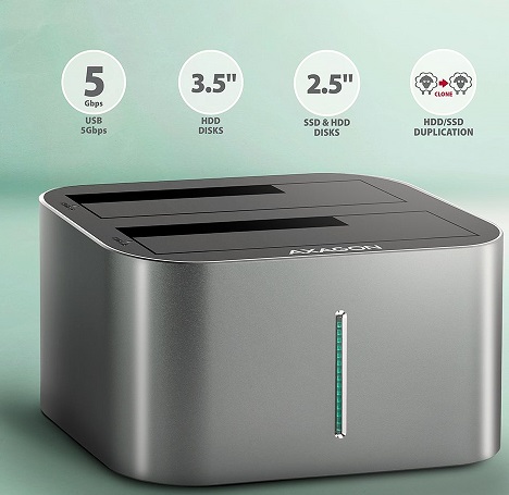 SuperSpeed USB-C 5Gbps dokovací / klonovací stanice AXAGON ADSA-DC DUAL CLONE připojí k počítači snadno a rychle až dva 2.5" nebo 3.5" disky současně. Připojení k počítači umožňuje moderní oboustranný USB-C konektor na doku spolu s dodávaným kabelem USB-C --- USB-A o délce 80 cm. Tento šikovný pomocník vám tak umožní nejjednodušší připojení 2.5"/3.5" SATA disků k počítači nebo notebooku. Jeden nebo i dva disky současně jen stačí zasunout do základny, nejsou potřeba žádné nástroje ani doplňky. Výměna disků je tak velmi rychlá a jednoduchá. Dokovací stanici také využijete pro snadné klonování obsahu připojených disků bez potřeby připojení k PC. Do prvního slotu stanice HDD A (source) zasunete zdrojový disk a do druhého slotu HDD B (target) zasunete cílový disk. Pak jen zmáčknete klonovací tlačítko a sledujete průběh klonování na stupnici čtyř LED diod. Po zkopírování všech dat je na cílovém disku přesná kopie původního disku. Dock tak lze využít jako autonomní zařízení pro pohodlné duplikování a vytváření obrazů disků. Jedná se o nejjednodušší způsob, jak přenést obsah například starého HDD disku na nový SSD disk, a to včetně funkčního operačního systému (Windows, macOS, Linux …). Rozhraní SATA 6G s podporou UASP dovolí užívat si rychlost moderních SSD disků. Podpora funkce TRIM pro omezení pozvolné degradace výkonu SSD v čase. Stanice umožňuje čtení S.M.A.R.T. informací monitorujících kondici HDD/SSD. Podporuje usínání připojených disků i stanice. Skříň stanice je dostatečně robustní a odolná, což umožňuje dokonalou stabilitu i s vloženými disky. Gumové nožky omezují posouvání po stole a vibrace pevných disků. Vnější plášť je proveden z hliníku s elegantním broušeným povrchem. Vstup: • USB-C 5Gbps (USB 3.2 Gen 1 / USB 3.0). • Rychlost až 5 Gbit/s. • Připojení přes USB-C female konektor. Podpora zařízení: • Rozhraní SATA III - 6 Gb/s (600 MB/s). • Podpora 2.5" HDD/SSD. • Podpora 3.5" HDD. • Max. kapacita disku - všechny bez omezení. • Max. výška 2.5" disku - všechny bez omezení. Vlastnosti: • Kompatibilní s USB 3.2 Gen 2 (USB 3.1 Gen 2) a zpětně kompatibilní s USB 2.0. • Podpora přenosových rychlostí 5000 / 480 Mbit/s. • Vyhovuje Serial ATA 3.0 specifikaci (SATA/600), přenosové rychlosti až 6 Gb/s (600 MB/s). • Vyhovuje Serial ATA 2.0 specifikaci (SATA/300), přenosové rychlosti až 3 Gb/s (300 MB/s). • Vyhovuje Serial ATA 1.0 specifikaci (SATA/150), přenosové rychlosti až 1.5 Gb/s (150 MB/s). • Celková propustnost / přenosová rychlost stanice je dána použitým USB rozhraním (teor. 5 Gbit/s). • Vyhovuje USB Mass Storage Class specifikaci. • Podpora BOT (Bulk-Only Transport). • Podpora UASP (USB Attached SCSI Protocol) pro rychlejší přenos dat ve Windows 8 a novějších. • Podpora funkce TRIM pro omezení pozvolné degradace výkonu SSD v čase. • Podpora S.M.A.R.T. (Self-Monitoring, Analysis, and Reporting Technology) systém monitorující stav disku. • Podpora bootování z HDD/SSD v dokovací stanici. • Možnost připojení zařízení za chodu díky podpoře Hot Plug. • Plná podpora Plug and Play. • HDD Auto Spin down - vypínání disků při nečinnosti. • HDD Turn Off - vypnutí disku po odebrání zařízení nebo uspání PC. • Připojení přes USB-C female konektor. • Kabel USB-C --- USB-A délky 80 cm je součástí balení. • LED indikující napájení HDD/SSD docku a aktivitu disků v obou šachtách. • Rozměry stanice 130 x 97 x 73 mm. • Hmotnost 307 g. Napájení: • Napájení pomocí přiloženého externího AC/DC adapteru 12V – 2.5A (30W) s kabelem délky 150 cm. • Vypínač napájení. Funkce klonování obsahu disku: • Klonování probíhá bez připojení stanice k počítači. • Cílový disk musí mít stejnou nebo větší kapacitu jako disk zdrojový, jinak nelze klonování spustit. • Klonovat lze jak pevné disky HDD tak SSD. • Rychlost klonování SSD až 300 MB/s. • Celkový čas naklonování disku závisí na kapacitě zdrojového disku, ne na objemu dat na disku. Podporované operační systémy: • Windows, macOS, Linux, Chrome OS. Balení obsahuje: • HDD/SSD dock, • USB-C --- USB-A kabel délky 80 cm, • napájecí adapter 100-240V / 12V-2.5A, • vícejazyčný návod CZ / DE / DK / ENG / ESP / FIN / FR / GR / HR / HU / IT / NL / PL / PT / RO / RU / SK / SWE / TR / BG / CN / ARA, • baleno v kartonové krabičce. Technická specifikace Vstup rozhraní USB 3.2 Gen 1 / USB 3.1 Gen 1 / USB 3.0 / USB 2.0 rychlost 5.000 / 480 Mbit/s ( super speed / high speed) konektor USB type C samice (na docku) konektor USB type A samec (na kabelu do pc) kabel 80 cm Výstup rozhraní Serial ATA 3.0 konektor 2x 22-pin SATA datový a napájecí samice kompatibilita všechny SATA I / SATA II / SATA III disky celková propustnost 5 Gbit/s teor. (dána USB 3.0 vstupem) Podporované zařízení 2.5" ano 3.5" ano max. kapacita disku všechny, bez omezení max. výška 2.5" disku všechny, bez omezení Podporované vlastnosti klonování disků ano UASP ano TRIM ano S.M.A.R.T. ano boot z připojeného disku ano automatická instalace ano Plug and Play ano Hot Plug ano Další vlastnosti provedení kov bezšroubková montáž ano indikace LED ovládací prvky tlačítko CLONE - spouští klonování disků rozměry 130 x 97 x 73 mm hmotnost 307 g Napájení po sběrnici ne napájecím adaptérem ano Podpora OS MS Windows 11 / 10 / 8.1 / 8 / 7 Mac OS X 10.x a vyšší Linux 2.6.x jádro a vyšší |