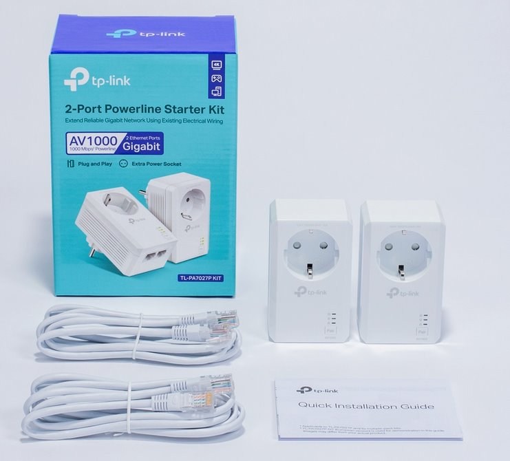 Klíčové vlastnosti Kompatibilní se zásuvkami standardu HomePlug AV2 – vysoká rychlost přenosu dat dosahující 1 000 Mbit/s uspokojí veškeré nároky vašich online aktivit. 2 gigabitové porty – adaptér poskytuje zabezpečenou kabelovou síť pro stolní počítače, chytré televize nebo herní konzole. Technologie „Plug and Play“ – umožňuje nastavit síť Powerline během několika minut, takže rychlé a bezproblémové kabelové připojení může být ihned dostupné. Dodatečná elektrická zásuvka – zajistí, aby žádná elektrická zásuvka nepřišla vniveč. Patentovaný režim úspory energie – automaticky sníží spotřebu energie až o 85 %. Obsah balení (2) Zařízení TL-PA7027P (2) Patch kabel |