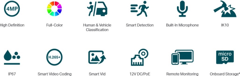Kameru je možné napájet přes 12V DC konektor, případně po ethernetovém kabelu přes 802.3af POE. Klíčové vlastnosti 4MP rozlišení (2560 × 1440 px), 30 fps 24h Full-Color - Získejte 24hodinové barevné detaily, a to i v podmínkách naprosté tmy Klasifikace lidí a vozidel a Smart detekce Vestavěný audio mikrofon Vysoká fyzická odolnost - IK10 proti vandalům a IP67 proti vodě Podpora H.265+ kodeku Více druhů napájení - 802.3af PoE a 12V DC konektor Flexibilní správa a úložiště - Převezměte plnou kontrolu nad svým zabezpečením pomocí čtyř metod správy: webového uživatelského rozhraní, uživatelského rozhraní NVR, aplikace VIGI a správce zabezpečení VIGI. Pro každou metodu je k dispozici místní úložiště, stejně jako integrované úložiště se slotem pro kartu SD (až 256 GB). Obsah balení Zařízení Vodotěsný kabelový nástavec Montážní příslušenství Technické parametry Kamera WDR:Digitální Typ objektivu:Fixní Objektiv [mm]:2,8 (fixní) Přísvit:IR, Bílé světlo Dosah přísvitu [m]:30 Pozorovací úhel [°]:96 Režim den/noc:Barevný Citlivost senzoru [Lux]:0,005 Obrazový senzor ["]:1/3 Obraz Rozlišení:4MP Technologie a vymoženosti:Full-Color Max. rozlišení [pixely]:2560 x 1440 (WQHD) Konektory a rozhraní Slot na paměťové karty:microSD - až 256GB Audio:Mikrofon Rychlost LAN:(1) 10/100Mbps Napájení Napájení přes PoE:802.3af Typ napájení:DC konektor, PoE Napájení přes konektor/svorkovnici:12V DC Fyzické charakteristiky Stupeň krytí:IP67 Použití:Venkovní Antivandal (ochrana proti nárazu):IK10 Provozní teplota [°C]:-30 až 60 Hmotnost [g]:195 Šířka [mm]:115 Výška [mm]:86 Hloubka [mm]:115 Barva:Bílá Kompresní standardy Datový tok:64Kbps ~ 4Mbps Počet streamů:2 Video komprese:H.264, H.265 Obecné Kamerová řada:VIGI |