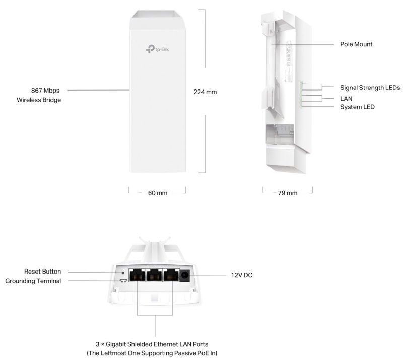 Každá z jednotek disponuje (3) 10/100/1000Mbps ethernetovými porty, resetovacím tlačítkem a konektorem pro uzemění. Na straně zařízení se nachází LED diody, které indikují stav zařízení, připojení ethernetu a úroveň signálu. První z trojice ethernetových portů podporuje vstupní pasivní POE 24V, druhou možnost napájení poskytuje DC konektor pro 12V. Montáž jednotek na stožár se provádí přiloženými plastovými stahovacími páskami. Efektivní centralizovaná správa sítě Díky softwaru ovladače Omada mohou malé a střední firmy mít z jednoho místa pod kontrolou stovky vnitřních i venkovních access pointů. A tento způsob řízení sítě je takový, jaký být má – efektivní a intuitivní. Technické parametry Bezdrátové vlastnosti Citlivost [dBm]:-94 Bezdrátové frekvence:5 GHz WiFi standardy:802.11n, 802.11a, 802.11ac Přenosová rychlost - 5GHz [Mb/s]:866 Vysílací výkon 5GHz [dBm]:28 Vyzař. úhel v elevační rovině (-6dB) [°]:90 Vyzař. úhel v azimutové rovině (-6dB) [°]:90 5GHz MIMO:2 x 2 Typ antény:Vestavěná Počet vestavěných antén:1 Zisk antény [dBi]:7 Konektory a rozhraní Rychlost LAN:(3) 10/100/1000Mbps Gigabit LAN:Ano Napájení Napájení přes PoE:24V DC Typy PoE:PoE-In (pouze) Max. spotřeba energie [W]:11,5 Napájení přes konektor/svorkovnici:12V DC Fyzické charakteristiky Použití:Venkovní Tlačítka:Reset Provozní teplota [°C]:-40 až 70 Hmotnost [g]:280 Šířka [mm]:60 Výška [mm]:224 Hloubka [mm]:79 Software Operační mód:Bridge, Access Point Výchozí IP adresa:Dynamická z DHCP Výchozí jméno a heslo:admin / admin Obsah balení (2) Zařízení (2) PoE napájecí adaptér 24V (2) Napájecí kabel (4) stahovací páska (4) Šroubky a hmoždinky |