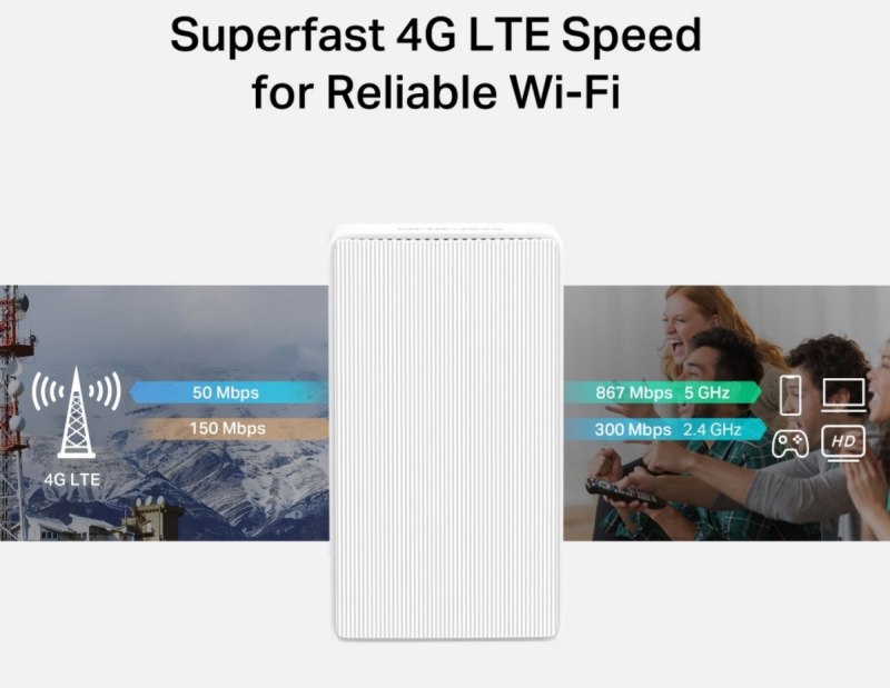 Využívejte internet naplno kdekoliv s 4G LTE routerem Mercusys MB130-4G, který Vás připojí k LTE síti rychlostí až 150Mbps download a 50Mbps upload. Pro zajištění stabilního mobilního připojení umožňuje router připojení externích 4G LTE antén. Sdílet internet na více zařízení můžete prostřednictvím dual-band WiFi5 s rychlostí až 867Mbps v 5GHz pásmu a 300Mbps v 2,4GHz pásmu. K routeru můžete připojit další zařízení pomocí 2xLAN portů, z nichž jeden dokáže sloužit i jako WAN port pro připojení kabelového připojení. V případě využití více druhů připojení zajistíte maximální dostupnost vašeho internetového připojení, kdy v případě výpadku kabelového připojení, router přepne na LTE.