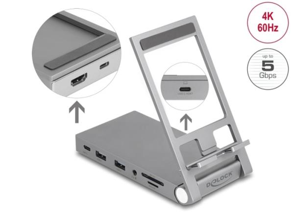 Tento dokovací stojan na tablety a laptopy s držákem, značky Delock, je přesvědčivý nejen svou konstrukcí, ale i stabilitou a funkčností. Gumové podložky připevněné na spodní straně a v držáku zajišťují, aby ani zařízení ani držák neklouzají.