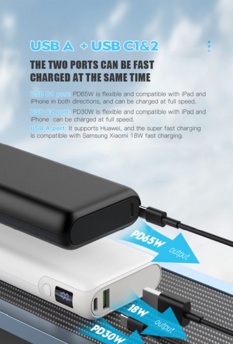 Tato efektivní powerbanka s kapacitou 20 000mAh, vybavená technologií Power Delivery 3.0 a výkonem 65W, je ideálním řešením pro dynamické lidi, kteří potřebují spolehlivý zdroj energie na cestách. Díky lithium-polymerovým bateriím a silnému výstupnímu výkonu dokáže tato powerbanka nabíjet většinu USB PD notebooků na trhu, což z ní dělá nepostradatelného pomocníka pro profesionály a studenty. <bKlíčové vlastnosti: Vysoce výkonné EV baterie použité v konstrukci: 21700 Li-ion (používané v elektromobilech), čtyři články, zajišťují přes 1000 nabíjecích cyklů a efektivní, dlouhodobou spolehlivost. Schopnost nabíjet notebooky a notebooky, takže je ideální pro lidi, kteří často pracují mimo domov. Výstupní výkon 65W USB Type-C PD, umožňující rychlé a efektivní nabíjení kompatibilních zařízení. USB Type C 65W vstup/výstup, zajišťující rychlé nabíjení jak powerbanky, tak zařízení k ní připojených. Dodatečný výstup USB typu A pro větší flexibilitu při nabíjení různých zařízení. Digitální LED displej, který zobrazuje aktuální úroveň nabití, umožňuje snadno sledovat stav baterie. Široká kompatibilita se standardy rychlého nabíjení, jako je QC 3.0, PD 3.0, SCP 22.5W, PPS, což z něj dělá univerzální řešení pro nabíjení nejrůznějších zařízení. Součástí dodávky je 30cm kabel USB Type-C pro pohodlí a přenosnost. Technické specifikace Kapacita: 20000mAh (3,7V 74Wh) Vstup: USB-C1: 5V/3A,9V/3A,12V/3A,15V/3A,20V/3,25A (PD65W) Výstup:USB-C1: 5V/3A, 9V/3A, 12V/3A, 15V/3A, 20V/3,25A (PD 65W) USB-C2: 5V/3A, 9V/3A, 12V2,5A USB-A: 5V/4,5A, 5V/3A, 9V/2A, 12V/1,5A (QC 18W) Celkový výstup:USB-C1+USB-C2: PD45W+PD30W USB-C1+USB-A: PD45W+QC18W USB-C1+USB-A+USB-C2: PD45W+QC15W USB-C2+USB-A: 5V/3A (15W)"" Velikost: 151,5*65,5*26mm Čistá hmotnost: 359 g Typ baterie: 21700 Li-ion baterie * 4ks Doby nabíjení:>1400 Barva:Černá" |