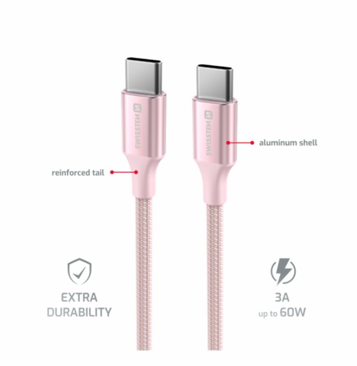 SWISSTEN DATOVÝ KABEL TEXTILE II USB-C / USB-C 1,5 M RŮŽOVÝ