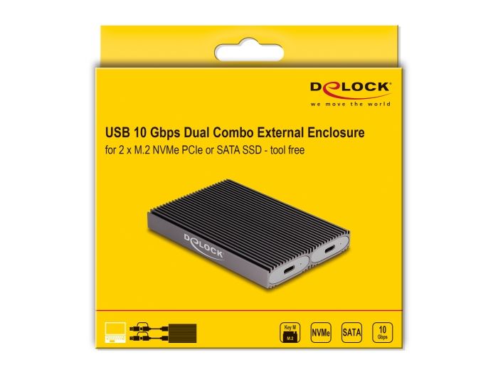 Toto pouzdro značky Delock umožňuje instalaci dvou SSD M.2. Používat a provozovat lze buďto SSD M.2 PCIe NVMe nebo SSD M.2 SATA ve formátech 2280, 2260, 2242 a 2230. Robustní kovový kryt s chladicími lamelami zajišťuje optimální teplotu paměti. Kombo pouzdro Velkou výhodou tohoto krytu Delock M.2 je, že do pouzdra lze vložit jak disky SATA, tak i PCIe (NVMe) M.2 SSD. Paměť bude automaticky rozpoznána čipovou sadou a pak ji bude lze používat. Instalace SSD bez nástrojů Speciální funkcí tohoto pouzdra je, že k instalaci SSD M.2 není potřeba žádných nástrojů. Vnitřní díl lze vytáhnout stlačením tlačítka, načež bude SSD vložen do slotu a přitlačen gumovou spojkou k desce. Technické detaily Konektor: externí: 2 x USB 10 Gbps USB Type-C™ samice interní: 2 x M.2 klíč M slot Chipset: Realtek RTL9210B Podporuje M.2 moduly ve formátu 2280, 2260, 2242 a 2230 s klíčem M nebo klíčem B+M na základě SATA nebo PCIe (NVMe) Maximální výška komponentů na modulu: 1,5 mm je podporována aplikace oboustraných modulů Podporuje NVM Express (NVMe) Možnost bootování Rychlost přenosu dat 10 Gbps 2 x LED indikující napájení a přístup Kovová skříňka Rozměry (DxŠxV): cca. 110 x 74 x 13 mm Hot Plug, Plug & Play Systémové požadavky Android 10.0 nebo vyšší Chrome OS Linux Kernel 5.11 nebo vyšší Mac OS 11.2.3 nebo vyšší Windows 10/10-64/11 iPad Air (4-mé generace) nebo vyšší iPad Pro (3-mé generace) nebo vyšší Surface Pro 7 Zařízení s volným portem USB Type-C™ nebo volný port Thunderbolt™ 3 nebo Thunderbolt™ 4 nebo Jeden volny USB Typ-A port Obsah balení Externí pouzdro M.2 2 x Kabel USB-C™ samec na USB-C™ samec (s adaptérem na USB Typu-A samec), délka cca. 45 cm 2 x tepelně vodivé podložky 2 x tepelně vodivá destička 4 x gumová špička Uživatelská příručka Balení Kartonová krabice |
