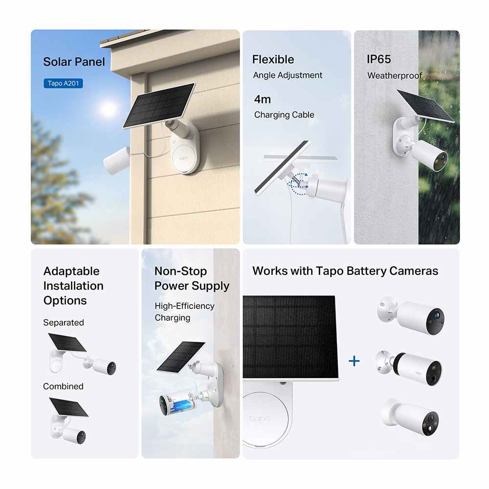 Funguje s bateriovými kamerami Tapo - Kompatibilní se všemi bateriovými kamerami Tapo1, což umožňuje celoroční ochranu vaší bateriové kamery Tapo. Flexibilní možnosti instalace - Můžete jej instalovat samostatně pomocí extra dlouhého kabelu o délce 4 m nebo vedle kamery, což vám umožní objevit optimální místa pro bezproblémové sledování. Nonstop napájení - Vychutnejte si nepřetržité napájení díky vysoce účinnému solárnímu nabíjení. K tomu, aby vaše fotoaparáty fungovaly, stačí 45 minut standardního slunečního světla denně.2 Solární články s vysokou účinností - Tapo A201 je vyroben z prvotřídních monokrystalických křemíkových článků, které zachycují velké množství sluneční energie a účinně ji přeměňují na energii elektrickou. IP65 Odolnost proti povětrnostním vlivům - Solární panel je odolný proti dešti a prachu díky stupni krytí IP65. Flexibilní zachycení světla - Solární panel lze připevnit na stěnu nebo střechu a pomocí úhlově nastavitelného držáku flexibilně nastavit jeho úhel tak, aby zachycoval dostatek slunečního světla. SOLAR PANEL Device Compatibility Works with Tapo C400, Tapo C410, Tapo C420, Tapo C425 and more. Check all supported models >> Connection Capacity A solar panel can only connect to one camera. Output Port Type-C *A Type-C to Micro USB adapter (Included) is required for a camera with a Micro USB charging port. POWER Power Source Sunlight Output Voltage Solar Panel Max Charging Voltage: 5.2 V Solar Panel Max Charging Power: 2.5 W Power Cord Length Solar Panel Charging Cable Length: 0.25m Solar Panel Extension Charging Cable Length: 3.8m GENERAL Weather Resistance IP65 Mounting Options Wall-Mounted Operating Temperature -20°C~45°C (-4°F~113°F) *The suitable temperature for Tapo A201 is -20?~45?. The working temperature range for battery charging should be maintained at 0?~45?. Storage Temperature -40?~60? (-40°F~140°F) Operating Humidity 10%~90% RH, Non-condensing Storage Humidity 5%~90% RH, Non-condensing Dimensions 173.42 × 120.42 × 15.7 mm (6.83 × 4.74 × 0.62 in) Package Contents Tapo A201 Solar Panel ×1 Adjustable Mounting Bracket ×1 Mounting Screws ×6 Mounting Anchors ×6 Base Cover ×1 Waterproof Gaskets ×6 Screw Caps ×2 Cable Zip Tie×1 Extension Wire ×1 Type-C to Micro USB Adapter ×1 Mounting Template ×2 Quick Start Guide Certifications CE, FCC, RoHS, RCM |