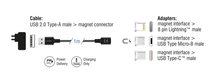 Tento nabíjecí kabel USB od Delocku se vyznačuje technologií magnetů a umožňuje snadné a rychlé připojení a odpojení zařízení od zdroje napájení. Použitím jednoho ze tří přiložených magnetických adaptérů lze nabíjet různá mobilní zařízení, tablety atd. přes rozhraní 8 pin, Micro USB-B nebo USB Type-C™. Adaptéry jsou navrženy tak, aby zůstaly uvnitř portu zařízení. Tak to může zabránit poškození portu zařízení a rovněž působí jako ochrana proti prachu. Nabíjecí kabel USB se může okamžitě připojit k zařízení pomocí kulatého magnetického konektoru. Kabel je díky robustnímu textilnímu stínění a kovovému pouzdru na obou koncích kabelu velmi robustní a odolný. Technické detaily Konektor: Kabel: USB 2.0 Typ-A samec > magnetický konektor Adaptér: magnetické rozhraní > 8 pin Lightning™ samec magnetické rozhraní > USB Typ Micro-B samec magnetické rozhraní > USB Type-C™ samec Podporuje jen funkci nabíjení Maximální výstupní proud: 3 A Napětí: 5 V Zelená indikace LED během nabíjení Průřez kabelu: 23 AWG napájecí vodiče Kabel s textilním stíněním Konektor v kovovém pouzdru Barva: černá Délka včetně konektorů cca. 1 m Systémové požadavky Napájecí zdroj s volným portem USB Typ-A samice Obsah balení Magnetický USB nabíjecí kabel 3 x magnetický adaptér Balení Kartonová krabice |