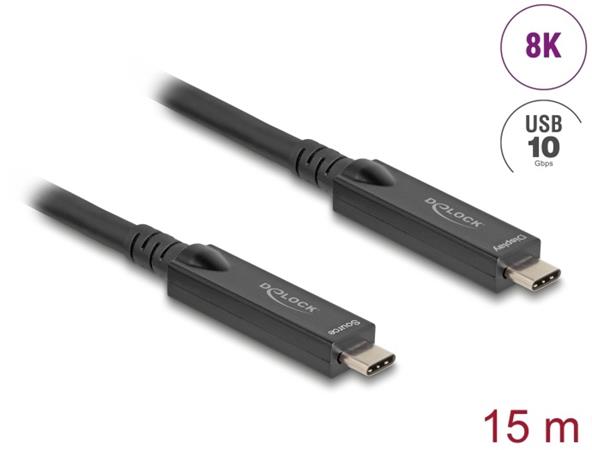Tento USB kabel od Delocku umožňuje připojení mezi zařízením s USB Type-C™ konektorem a PC nebo notebooku vybaven volným USB Type-C™ portem. Aktivní optický kabel Tento aktivní optický kabel využívá optické vlákno k přenosu velmi rychlých signálů. V porovnání s tradičními měděnými kabely je měkčí, tenčí, lehčí a umí signály přenášet beze ztrát na větší vzdálenosti. DisplayPort 2.1 se 4 linkami Tento kabel je vhodný k připojení monitoru s rozhraním USB-C™ a s rozlišením až 8K Ultra HD (7680 x 4320 @ 60 Hz) k počítači s rozhraním USB-C™ a podporou alternativního režimu DisplayPort. Při připojení k dokovací stanici se souběžným provozem rozhraní DisplayPort a USB při přenosové rychlosti 10 Gbps je možné dosáhnout rozlišení 3840 x 2160 @ 120 Hz. USB s rychlostí 10 Gbps Aktivní optický kabel umožňuje datové přenosové rychlosti až 10 Gbps při připojení zařízení kompatibilních s USB 10 Gbps. Samozřejmě lze připojovat i zařízení s rozhraním USB 2.0. Podporuje napájení USB do výkonu až 60 W Vzhledem k podpoře normy USB Power Delivery lze připojená zřízení napájet výkonem až 60 W (20 V / 3 A). Poznámka Tento kabel je kompatibilní se zařízeními DisplayPort (alternativní režim DP) a nefunguje se zařízeními Thunderbolt™. Technické detaily Konektor: 2 x USB 10 Gbps USB Type-C™ samec Aktivní optický kabel: hybridní kabel vlákno / měď Podporuje 2 / 4 linky DisplayPort 1.4 Podporuje Display Stream Compression 1.2 (DSC) Podporuje alternativní režim DP Přenos audio a video signálu Maximální rozlišení (v závislosti na systému a připojeném hardware): DisplayPort 2.1 s DSC: až 7680 x 4320 @ 60 Hz (4 Lanes) DisplayPort 1.4 s DSC: až 3840 x 2160 @ 120 Hz (2 Lanes) Podporuje HDR (High Dynamic Range) Podporuje HDCP 1.4 a 2.2 Jasně daný směr signálu pro video (Source / Display) Nesměrový pro data Rychlost přenosu dat 10 Gbps Zpětně kompatibilní s USB 2.0 Výstupní proud: až 3 A Materiál obalu kabelu: TPE Průměr kabelu: cca. 6,5 mm Barva: černá Délka včetně konektorů cca. 15 m Systémové požadavky PC nebo notebook s volným portem USB Type-C™ a alternativním modem DisplayPort Monitor s volným rozhraním USB Type-C™ (DP Alt Mode) Obsah balení USB 10 Gbps kabel Balení Box |