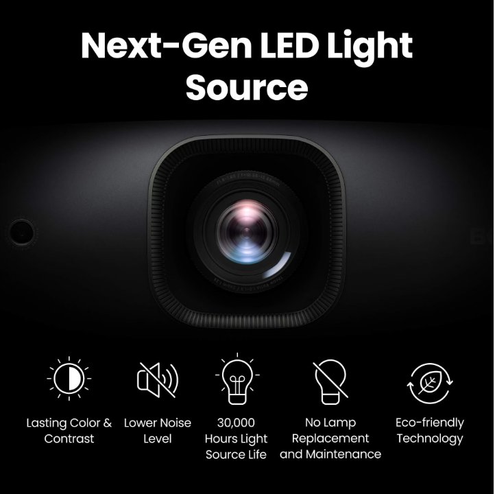Režim AI Cinema přizpůsobuje barvy na základě scény a okolního osvětlení pro dosažení vynikající kvality obrazu. Dodává se s individuální zprávou o kalibraci z výroby, která zajišťuje 100% přesnost barev Rec.709 s Delta E<3. Je vybaven odolnou LED diodou s životností 30 000 hodin pro trvalé používání. Technické údaje - Zobrazení Jas (ANSI lumenů) 2500 Rozlišení 4K UHD (3840 × 2160) Nativní poměr stran 16 : 9 Kontrastní poměr (FOFO) (se stmíváním světelného zdroje), 2 000 000 : 1 Počet zobrazitelných barev 30 bitů (1,07 miliardy barev) Světelný zdroj 4LED Životnost zdroje světla Dynamic 20000 hrs, a. Normální režim 20 000 hod., b. Režim ECO 30 000 hod. -Optické parametry Projekční poměr 1.0 ~ 1.3 Poměr zoomu 1,3× Objektiv F/# 1.8 - 1.85 mm, f 10.55 (Wide)~13.7(Tele) Posunutí projekce (plná výška) 100% Korekce lichoběžníkového zkreslení 2D, (automaticky) ± 30 stupňů ve svislém směru; ± 30 stupňů ve vodorovném směru Vertikální posun objektivu Vertical ±5% - Obraz Pokrytí DCI-P3 90% Pokrytí Rec. 709 98% Režimy obrazu AI Kino, HDR AI Kino, 3D, Jasný, Kino, REŽIM FILMMAKER MODE, REŽIM FILMMAKER MODE HDR, HDR Kino, HDR10, HDR10+, HLG, ISF Day, ISF Night, Uživatel - Kompatibilita Zpoždění na vstupu 12.8ms (1080P 120Hz), 6.5ms (1080P 240Hz), 17,9 ms (1080P 60 Hz), 17,9 ms (4K 60 Hz) Podporované rozlišení VGA (640 × 480) až 4K UHD (3840 × 2160) Horizontální frekvence 15K÷270KHz Vertikální snímková frekvence 23~240Hz - Konektory Vstup HDMI HDMI-1 (2.1/HDCP2.3) (4K 60Hz/ALLM), HDMI-2 (2.1/HDCP2.3) (4K 60Hz/ALLM/Audio Return+), HDMI-3 (2.1/HDCP2.3)(4K 120Hz *downscaling to 1080p 120Hz), HDMI – interní (2.0b/HDCP2.2) USB Type A USB Type A-2 (2.0/Napájení 1.5A/Čtečka/Upgrade FW), USB Type A-3 (2.0 / napájení 2,5 A) USB Type Mini B USB Type Mini B-1 (servisní) Vstup RS232 (DB, 9 pinů) (x1) Spínací napětí 12 V stejnosm. (3,5mm konektor) (x1) - Zvuk Reproduktor (x2), 5 W Výstup zvuku (3,5mm mini konektor) (x1) Zpětný zvukový kanál HDMI Yes, eARC, Dolby Atmos S/PDIF Vícekanálový, RAW - Prostředí Provozní teplota 0 – 40 °C Napájení 100 až 240 V stř., 50/60 Hz Typická spotřeba energie (110 V) Max 241W, Normal 183W@220V, Eco 133W@220V Spotřeba energie v pohotovostním režimu <0,5 W Hlučnost (typ./eko.) (dB) 28/26 dBA - Příslušenství Adaptér pro Android TV QS02, (standardně) Dálkový ovladač s baterií RCI074 Napájecí kabel (podle regionu) x1 (3,0 m) 3D brýle (volitelně) Krytka objektivu Ano - Rozměry a hmotnost Rozměry (Š × V × H) (mm) 420 x 143 x 305 mm Čistá hmotnost (kg) 6.4 kg +/- 0.1kg - Projekční systém DLP |