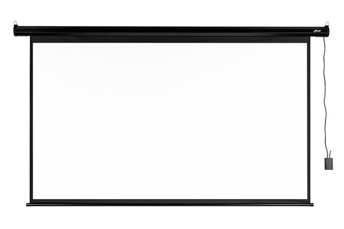 Projekční plátno roletové, rozměr 204 cm × 115 cm, úhlopříčka 92", poměr stran 16:9, matně bílé plátno, černé okraje, černé tělo, k umístění na strop a na zeď, motor pro navíjení, s dálkovým ovládáním