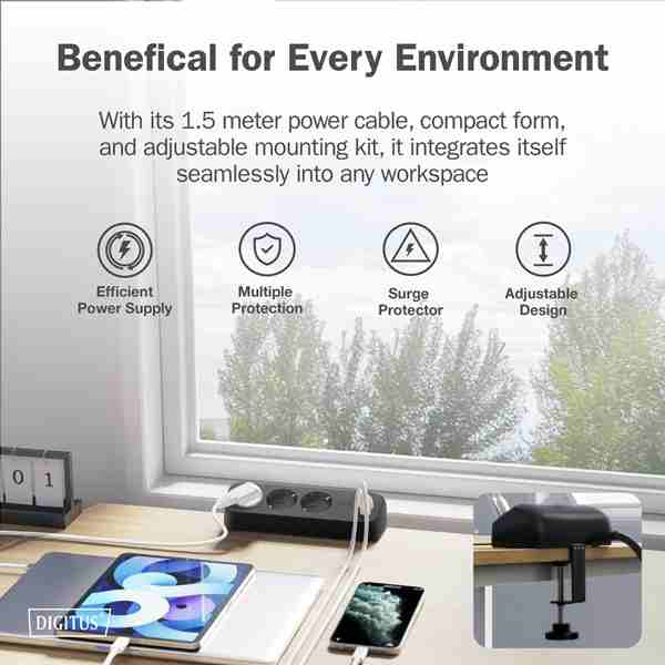 Designový prodlužovací kabel s USB porty a montáží na stůl - ideální pro pracovní stanice v domácí kanceláři nebo kanceláři. 3x uzemněné zásuvky v uspořádání pod úhlem 45° 2x USB-A (5V/2,4A - 12W) pro nabíjení mobilních zařízení 1x USB-C (15V/2A - 30W) pro nabíjení mobilních zařízení, tabletů atd. S upevňovacími svorkami - snadná instalace na stůl bez šroubů. Ochrana proti zkratu, přehřátí a přepětí Ochrana proti nadproudu (s automatickou obnovou) - Zabraňuje poškození v důsledku nadměrného napájení proudem Třída ochrany: IP20 - Ideální pro vnitřní použití Jmenovitý proud / jmenovité napětí: 16A / 250V Frekvence: 50 Hz Vysoce kvalitní napájecí kabel (H05VV-F 3G1,5 mm2) – pro maximální bezpečnost Vylepšete si pracovní prostor s tímto praktickým stolním prodlužovacím kabelem. Součástí dodávky je stolní svorka, která vám umožní umístit prodlužovací kabel kamkoli potřebujete. 1,5m napájecí kabel a kompaktní design usnadňují integraci do většiny sestav. Tři uzemněné zásuvky napájejí vaše zařízení přímo u stolu. Konstrukce s úhlem 45° umožňuje připojení větších zástrček, aniž by blokovala jiné zásuvky. Tři nabíjecí porty USB umožňují pohodlné nabíjení mobilních zařízení, ať už jde o chytré telefony nebo tablety. Integrovaná krytka a vylepšená ochrana proti kontaktu uzemněných zásuvek zajišťují vaši bezpečnost i bezpečnost ostatních a umožňují vám pracovat s klidem. Technické detaily Připojení: 3x uzemněné zásuvky 2x port USB-A 3.2 Gen 2 - 1x 12W (5V/2,4A), 1x 12W (5V/2,4A) 1x port USB-C 3.2 Gen 2 - 1x 30W (15V/2A) Montáž otočnou svorkou - snadná instalace bez šroubů Ochrana proti zkratu, přehřátí a přepětí Ochrana proti nadproudu (s automatickou obnovou) - Zabraňuje poškození v důsledku nadměrného napájení proudem Barva produktu: Černá Pouzdro: Plast (PC) Třída ochrany: IP20 Kabel: H05VV-F 3G1,5 mm2 Hmotnost: 480 g Rozměry: D 20 x Š 7 x V 6 cm Provozní teplota: 0 °C - +25 °C Délka kabelu: 1,5 m Barva kabelu: Černá Jmenovitý proud / jmenovité napětí: 16A / 250V Frekvence: 50 Hz Konstrukce: Tloušťka desky stolu až 58 mm Rozsah dodávky 1x 3cestná stolní zásuvka, černá 1x upevnění pomocí svorky 1x Rychlý indukční měřič (QIG) |