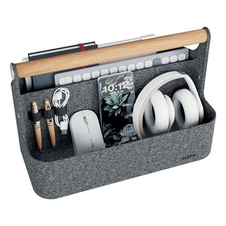 Tento úložný stolní box, vytvořený zejména pro hot desking a flexibilní pracovní prostory, má dvě prostorné přihrádky pro uložení kancelářských potřeb, jako je notebook, kompaktní klávesnice, láhev na vodu, zápisník nebo mobilní telefon, a tři pružné držáky na psací potřeby nebo kabely, vše můžete mít přehledně uspořádáno a rychle dostupné. Jak se říká - pořádek na stole, pořádek v hlavě. Tento přenosný stolní box je promyšleně vyroben z odolného materiálu - ze 100% recyklované termoplsti (a je dodáván v obalu bez plastů). Navíc skvěle vypadá - dřevěná rukojeť mu dodává přirozený estetický vzhled a zároveň slouží ke snadnému a pohodlnému přenášení, minimalistický design v kombinaci s příjemným šedým textilním povrchem zajistí efektivní a stylovou flexibilní organizaci osobních pracovních potřeb. Ať už jste v kanceláři, doma nebo máte hybridní pracovní model, tento kompaktní úložný prostor určitě oceníte. Kromě ukládání pracovních potřeb můžete do boxu ukládat také potřeby pro ruční práce, tvoření či různé hobby, s maximálním hmotnostním limitem 7,5 kg. Máte pro dnešek hotovo? Díky rozměrům 38 x 19 x 25,5 cm lze přenosný stolní organizér snadno uložit do skříňky nebo police a uvolnit tak cenné místo na stole. Přenosný organizér na stůl Leitz s rukojetí je, díky spojení pohodlného domáckého a praktického chytrého designu, ideálním doplňkem do domácnosti, kanceláře, školy, studovny, co-workingového centra apod. Zůstaňte organizovaní, produktivní, bez stresu a s dobrým pocitem v práci i mimo ni. Prémiové moderní úložné řešení vhodné pro všechny druhy firem a organizací Elegantní dřevěná rukojeť pro snadné a pohodlné přenášení S rozměry 38 x 19 x 25,5 cm má ideální velikost pro vaše vybavení a snadno se vejde do skříněk a polic Užitečné rozdělovače udrží vše na svém místě, takže notebook, kompaktní klávesnice, láhev s vodou a další vybavení zůstanou přehledně a bezpečně uložené Obsahuje 3 praktické elastické držáky na kabely, psací potřeby a další drobné předměty Stálý, odolný termofilc chrání techniku a povrchy před odřením a poškrábáním Vyrobeno ze 100% recyklované termoplsti s obalem bez plastů Vysoce kvalitní design a stylový vzhled, který zapadne do vaší kanceláře nebo domácnosti Udržuje váš pracovní prostor bez nepořádku, takže se můžete soustředit na důležitější věci Možnosti využití jsou velké - od uložení uměleckých či hobby řemeslných výtvorů, přes drobné hračky a kosmetické doplňky, až po pracovní vybavení Lehký, ale pevný, unese až 7,5 kg |